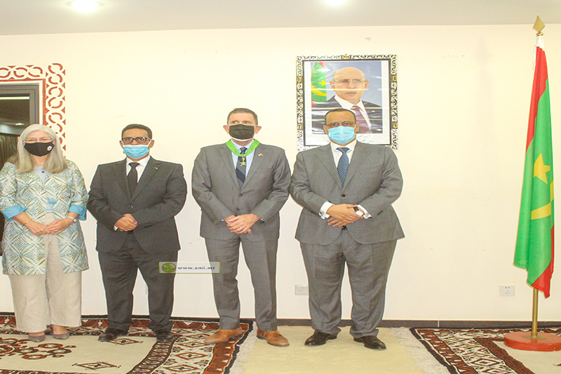 Le Ministre des affaires étrangères, de la coopération et des Mauritaniens à l’extérieur, M. Ismail Ould Cheikh Ahmed, au nom du Président de la République, Son Excellence M. Mohamed Ould Cheikh El-Ghazouani, a décoré l’ambassadeur des États-Unis d’Amérique, SE M. Michael Dodman, de la médaille de Commandeur de l’Ordre national du Mérite, à l’occasion de la fin de sa mission dans notre pays.Ont assisté à la cérémonie le secrétaire général du Ministère, M. Ahmed Sid’Ahmed Edje, les conseillers et chargés de mission au cabinet du ministre, les directeurs des départements centraux et de nombreux fonctionnaires du secteur.