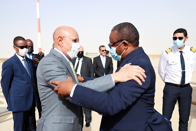 Le Président de la République, Son Excellence Monsieur Mohamed Ould Cheikh El Ghazouani, a accueilli, lundi après-midi, à l’aéroport international de Nouakchott Oumtounsy, le Président de la République de Guinée-Bissau, Son Excellence Monsieur Umaro Sissoco Embaló, en escale technique.Étaient également à l’accueil du président bissau-guinéen, le Premier ministre, Monsieur Mohamed Ould Bilal, le ministre secrétaire général de la Présidence de la République et la ministre conseillère à la Présidence de la République ainsi que des membres du gouvernement, le directeur de cabinet du Président de la République, le chef d’État-major particulier du Président de la République, le wali de Nouakchott Ouest, la présidente de la Région de Nouakchott et le chargé d’affaires de l’ambassade de Guinée Bissau à Nouakchott.